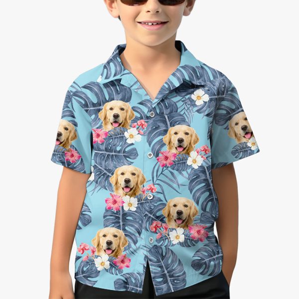 Custom Photo Kid Tropical Leaves And Pet – Dog & Cat Personalized Custom Unisex Tropical Hawaiian Aloha Shirt – Summer Vacation Gift, Birthday Gift For Kids, Pet Owners, Pet Lovers